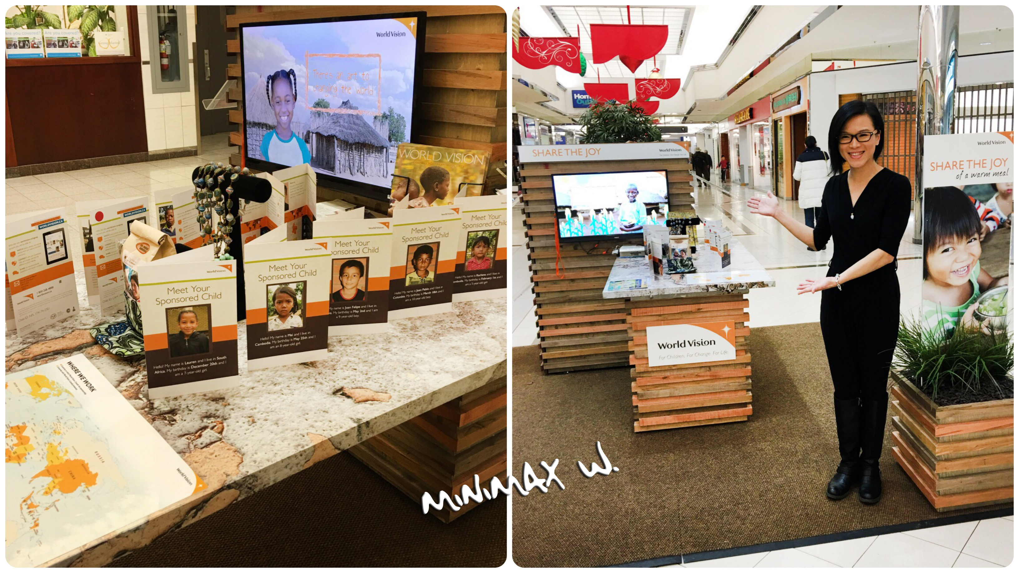 一直以來世界展望會致力於幫助來自各國(尼泊爾、柬埔寨、喬治亞、非洲各國等)需要物資救助的孩童,並且協助尋找贊助者以『助養』的方式,每個月加幣 $39 起,給孩子們更好的成長及教育環境。受到贊助的孩童會每年寫信、畫畫給贊助者,簡單報告自己的近況,相當窩心;如果想前往探望,也可以透過世界展望會的安排成行。這個活動是永續經營的,在世界各國的商場都不定期設置攤位。在溫哥華,上上週剛結束在 Downtown 的活動,接下來會在......