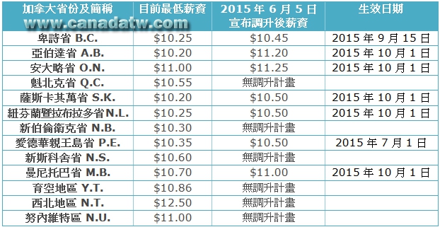 親愛的朋友們!好消息來了!今年 2015 下半年開始,許多省份將陸續調漲基本薪資!!目前在來加拿大打工的朋友們今年實在是太幸運哦,希望大家今年賺得更多。小編在這邊也為大家整理出了一張表格,表格裡有各省份的最新調漲的基本薪資,各省份的朋友們一起參考看看,請大家瘋狂傳閱吧!!
