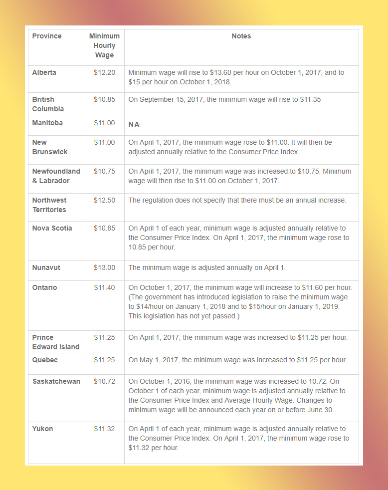 廢話不多說,以下是加拿大各省最新的最低薪資調整,又比去年多了一點。但其實也不要竊喜,這代表不久之後物價也會跟著漲上去。(淚奔)